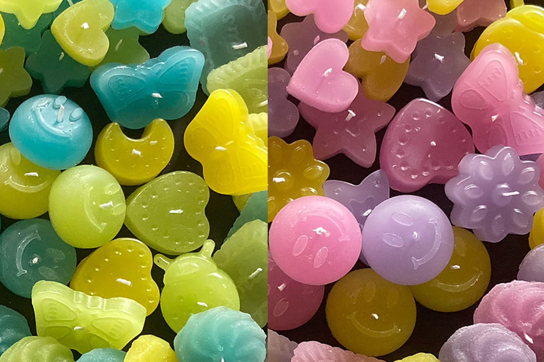 ニコニコマーク、クッキーのキャンドルなどカラフルでかわいいキャンドルがたくさんあります