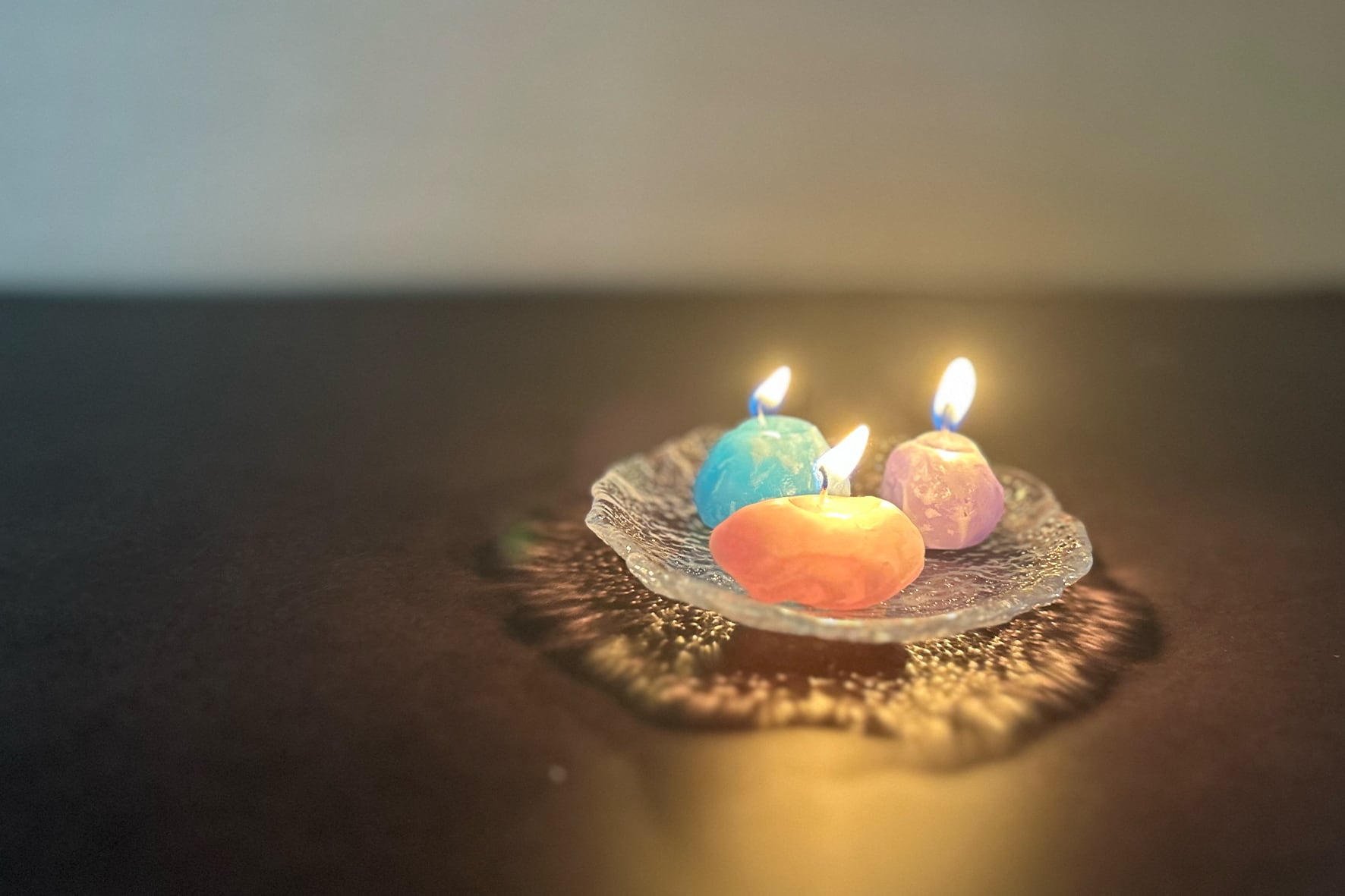1時間ほどの小さな灯りの、カラフルで小さな石のキャンドルです
